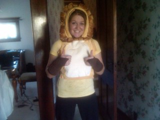 The second costume I made was a fixer for my friend Casey. She found a lion costume in an infant size that she cut the arms and legs off of so she could just slip it over her head. She then but open the sides to fit her body. She then brought it to me haha. We decided that she needed some fuzzy arms and legs to add to the costume and that some elastic up the sides would finish the body. So once again, I got some fleece this time, took the measurements, and set out on my adventure. The legs were pretty simple, make a tube with elastic at the top to cover her shins. Easy. The arms I wanted to be cuter than just a sleeve, so I decided that the sleeve should cover her and and come to a point at her finger.