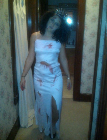 With all the other costume making and I no time to make my own costume! So, on Friday, the day I needed a costume, I looked at my resources and came up with something. Meet the Zombie Homecoming Queen: