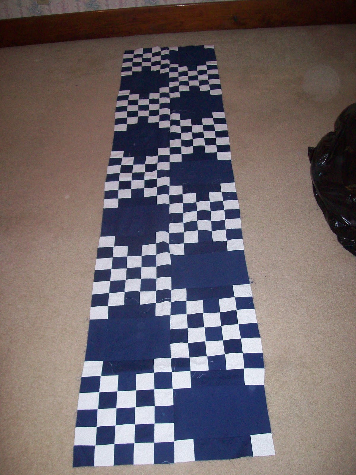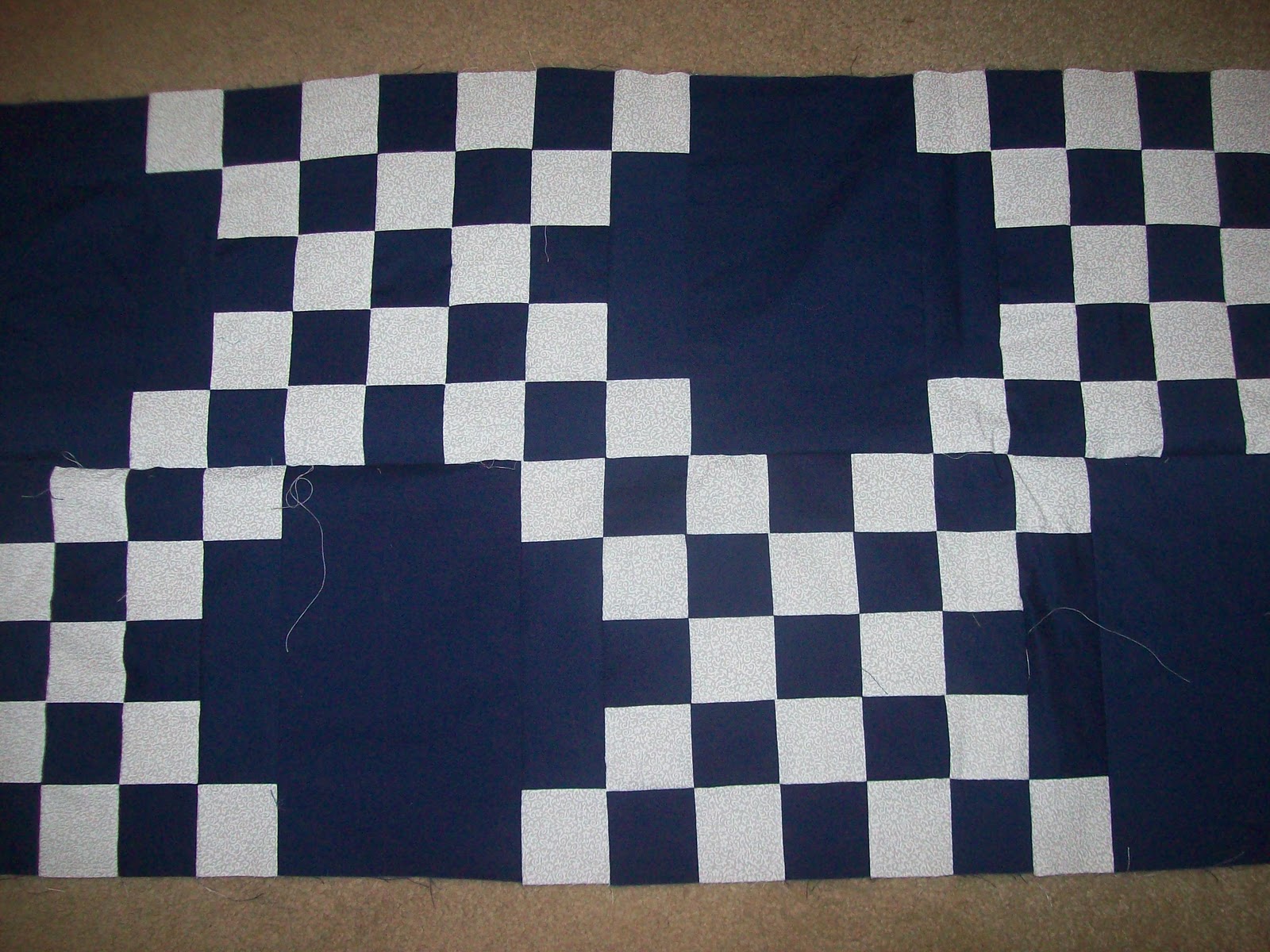 Back in high school I made a really beautiful quilt for my boyfriend at the time. The pattern was called True Lover’s Knot and involved nine patches (this isn’t mine but it looks almost identical). I used a navy blue fabric and a white on white so it was still masculine and very sharp. It is a gorgeous quilt that I hope he still enjoys using. I finished it 2004 and since then my mother has gone on and on about how much she loved it and that she wants one identical to it (she has a love for little squares lol). So this year since I knew I was going on the quilt retreat I decided it would be a great time to make my mom her quilt. There was one catch tho, I didn’t want to use the same pattern. It just seemed weird and I didn’t want to make the same exact quilt. She and Roy deserved their own pattern. Now, there is NO shortage of quilt patterns that have small squares so I didn’t have any problems finding one that she and I liked. We decided on the Double Irish Chain. Roy is part Irish, it was mostly little squares, and I could easily be made in Navy and White. The book that I found the pattern in had the quilt coming out to be the size of a full. My mom has a California King bed, so some adjustments definitely had to be made. I double the fabric amounts it listed and that would be more than enough for the top. WRONG. I cut the fabric I thought it would require before the retreat, thinking to myself “now all I have to do is sew it at the retreat!”. When it came time to work, I was seriously disappointed to find out that I needed to cut MORE fabric and then to see that all the fabric I had bought was used up. Now obviously this didn’t ruin the quilt or anything, I just don’t like it when things don’t work out the way I hope they would. I was still able to get a good amount of work done, but I can’t help but wonder how much progress I would have made if I hadn’t had to spend my time cutting. SO, here is what I was able to get done: