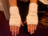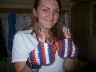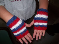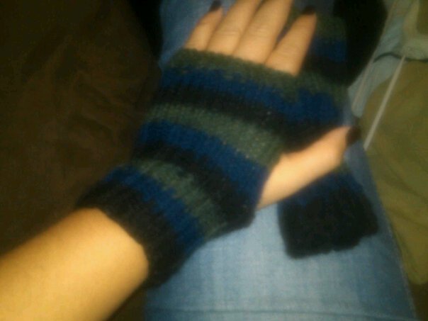 At the beginning of the summer my Aunt died very suddenly. She sewed mostly clothes and had a pretty large knitting collection. When my uncle was going through her things he loaded up all of her sewing supplies and gave them to my sister and I. There was a lot of fabric and supplies that Cassie and I divided between us. Now, Cassie doesn’t really sew clothes so I inherited all the patterns and such. Also amongst the things was a LARGE basket full of yarn and knitting needles and crochet hooks. Again, Cassie doesn’t knit so it came down to whether or not I wanted it. I had learned to knit in college once but hadn’t kept it up enough to remember anything. Looking at that basket, something clicked in my mind and I felt the need to relearn how to knit. So I took the basket and was determined to do something with it. I bought a couple “how to” books at Joanns and picked a scarf to be my first attempt at knitting. Let’s just say it was a “vintage” looking scarf that went to my mother as a birthday gift (she HAS to like whatever I make haha). Next came a pair of fingerless gloves. They seemed easy enough. No circular needles or anything fancy required. I made the first pair for myself, which was good because then I could change whatever I wanted about them. They came out wearable and I certainly enjoying them in this weather. Since making that pair, I haven’t stopped making them yet