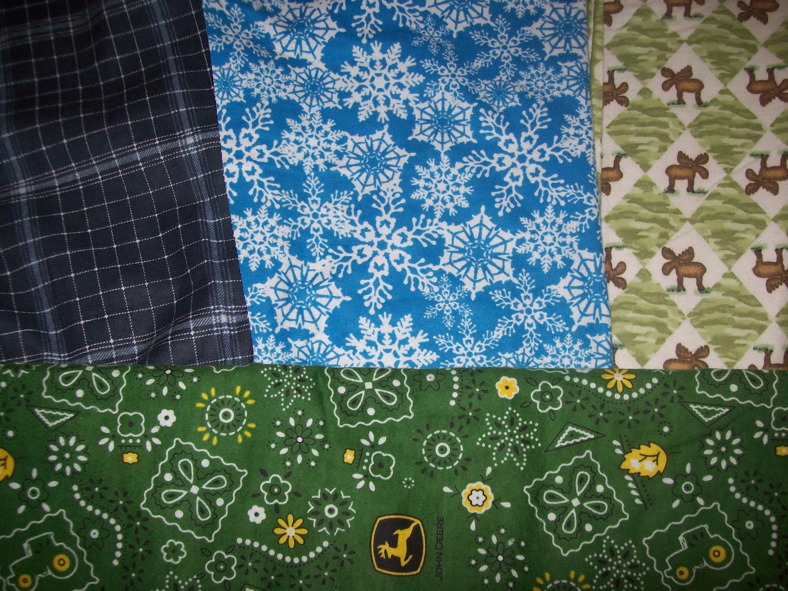 I chose a blue plaid for Roy. He’s not a very flashy guy so I thought the fabric suited him. My mom loves blue and when I saw the snowflake fabric I knew she would love it. (I do too, so I bought enough to make myself some shorts!!) Cassie’s is the John Deere and mine are the moose! For those that know me, you know of my deep love for moose. I will have one as a pet someday!