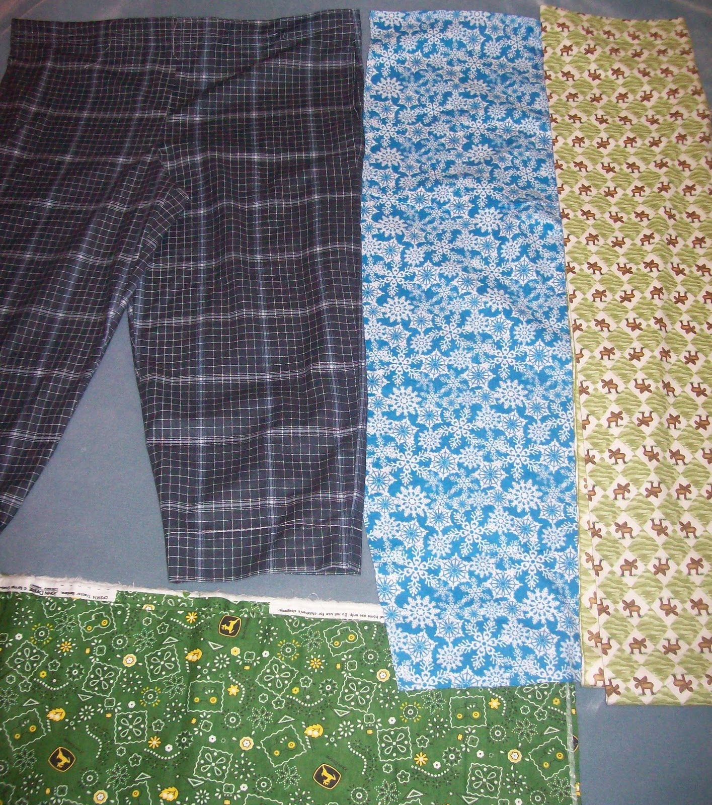 Back during the summer months I told my sister I would make her a pair of flannel John Deere pajama pants. There was never a real dead line for said pants so I didn’t start really thinking about making them until Christmas was in my sites. Then the other day I overheard a woman at Joann’s talking about how she was making Christmas pajama pants for her children and grandchildren to wear on Christmas Day. I had an epiphany! Why not make my family pajama pants to wear for Christmas?! I already had the fabric for Cassie’s and a couple patterns so I was already ahead of myself! Since Cassie’s weren’t Christmas themed I decided not to make the others in Christmas fabric. Last night I started with Roy’s(my step dad) pants and got pretty far on them. Tonight I was able to basically finish them, minus the drawstring in the waist. I also cut out the fabric for my mom’s pants as well. I’m pretty happy with the amount of progress I’ve made given that I only bought the fabric yesterday!