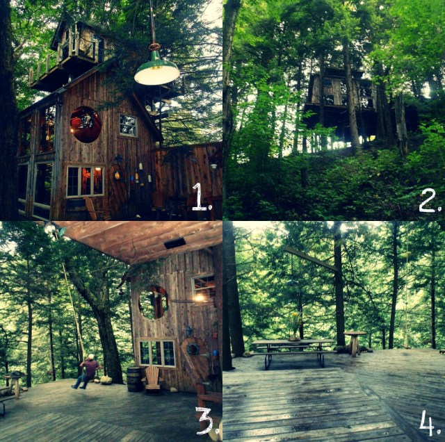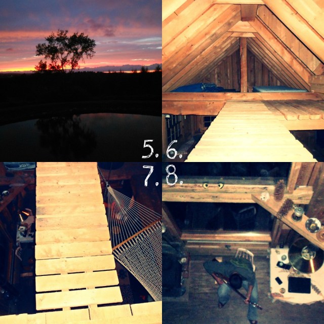1. a view from the deck. look closely and you’ll see the crows nest up above. 2. there’s a creek that runs below the cabin…like its own little gorge. 3. Geoff swinging on the swing. 4. the deck. behind that picnic table is a hammock. 5. the sunset from the high dive. 6. the catwalk. 7.the view from above the first floor 8. brother Jer playing us some tunes next to the stove.