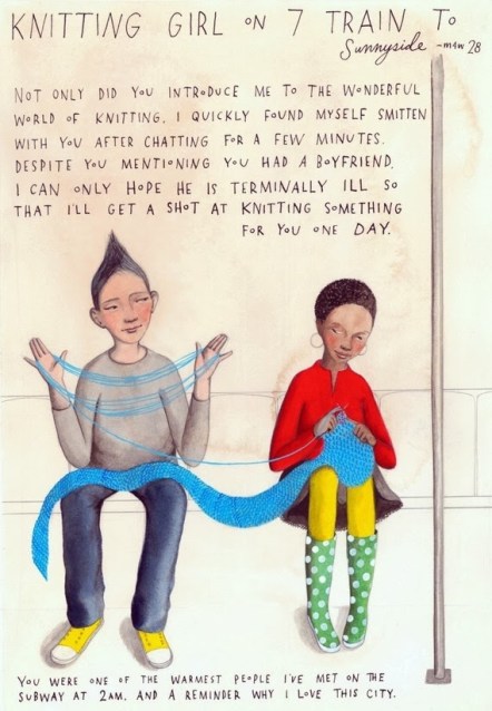 So I stumbled upon this illustration this morning and instantly fell in love with it. Upon further investigation I learned that it’s from a series of wonderful illustrations by Sophie Blackall that gives those Missed Connections posts on craiglist some life. They’re amazing and for purchase on Sophie’s Etsy page here (for someone whose birthday could be coming up in March{cough, cough}). As I was looking through her website I also realized that I’ve been looking at her work for over a year now and didn’t even realize it. Her work was chosen for the Art in the Subway paintings that you can find inside the subway cars here in the city.